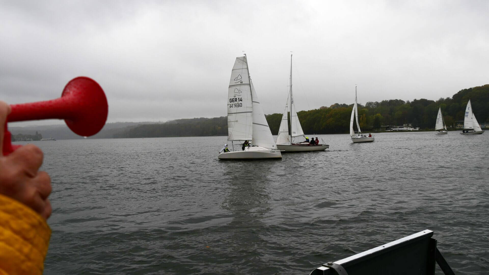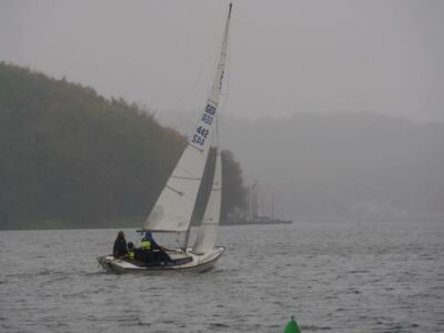 Zunächst war kein Wind und es war ziemlich grau. Als der Wind kam, wurde es nass. Nach einer Wettfahrt war der Vormittag um und die geplante 2. Vormittags-Wettfahrt fiel aus. Aber dann ... Das Wetter wurde besser es gab immer mehr Sonne und Wind. Und bei der letzten Wettfahrt wurde es eng, so eng, dass alle teilnehmenden Boote auf ein(!) Zielfoto passten. Also Spannung, viel Spaß und ein Ausklang bei Sonne; was will man mehr?